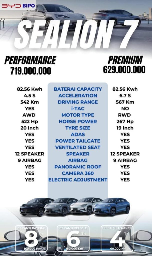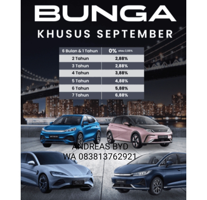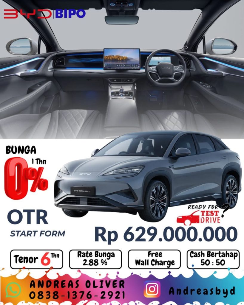 ✓ POTONGAN DISKON TERBAIK ✓CASHBACK 20 JUTA UP( UNTUK TIPE SEALION 7 DAN SEAL) ✓ TENOR SAMPAI DENGAN 6 TAHUN ✓ RATE BUNGA MULAI DARI 1.88 PERSEN TENOR 1 TAHUN , 2.88 PERSEN TENOR 2 TAHUN -3 TAHUN , 3.88 PERSEN TENOR 4TAHUN ✓ BUNGA 0 PERSEN TENOR 1 TAHUN ✓ CASH BERTAHAP 50:50 BUNGA 0 PERSEN ✓ FREE ASURANSI ALLRISK 2 TAHUN SENILAI 13.5 JUTA ✓ TERIMA TUKAR TAMBAH MOBIL LAMA ANDA ✓ FREE TEST DRIVE KERUMAH ANDA ✓ FREE VOUCHER NANO COATING ✓ FREE MAINTENANCE 4TH/ 60 RB KM ✓ V2L ✓ FREE TOWING ✓ GARANSI BATERAI 8 TAHUN / 160 RB KM